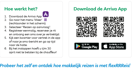 De vertrektijd van flexRRReis kan tot 15 minuten eerder of later zijn dan de tijd die je hebt gekozen. Dit komt doordat het systeem de route van het voertuig aanpast op basis van alle geboekte ritten. Kijk daarom vlak voor vertrek in de app of SMS om te zien hoe laat je echt vertrekt.